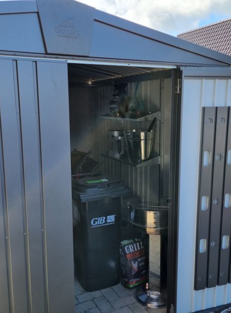 Hauswirtschaftsraum: Waschmaschine, Bügeleisen, Bügelbrett, Wäscheklammern, Erste-Hilfe-Material, Kühltasche, Kinderhochstuhl, Gartenmöbelauflagen (im Gerätehaus)