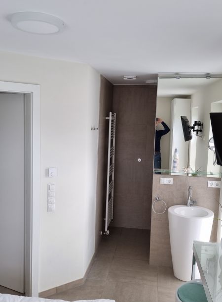 Bettanlage (180×200) mit Nachtschrankablage und kl. Lampe, 2-türiger Kleiderschrank, Kommode mit Hocker, 32-Zoll-Fernseher; Im Schlafzimmer integriertes Tageslichtbad mit einer ebenerdigen Großraumdusche und Designer-Waschbecken und Spiegel, Fön.