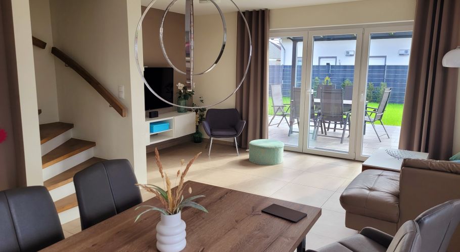 Die in 2018 neu gebaute Doppelhaushälfte für bis zu 6 Personen ist hochwertig ausgestattet. Nach Erwerb in 2022 haben wir folgende Ergänzungen vorgenommen: Terrassenüberdachung, Gerätehaus mit Wallbox und Steckdosen zum Laden von E-Autos.